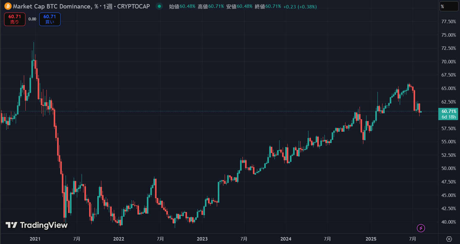 この指標は、市場全体の動向を把握する上で非常に有効です 。ドミナンスが高いほどビットコインが市場で優位な地位を占めており、ドミナンスが低下するほど、ビットコイン以外のアルトコインが存在感を増していると判断できます 。ビットコインドミナンスの低下は、アルトコインシーズン到来の兆候となることが多いです 。