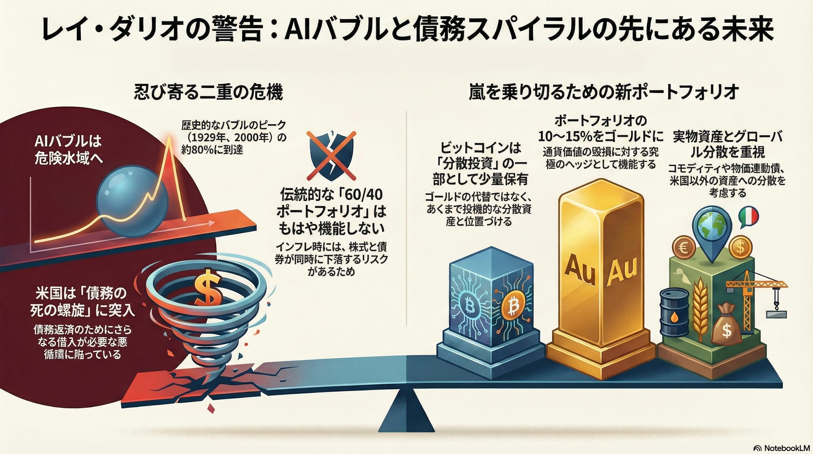 しかし、歴史の深層流を読み解く賢者、レイ・ダリオ氏の目には、全く別の景色が映っています。それは、「巨大な債務の重圧」と「過熱する技術バブル」、そして「崩れゆく帝国」が交差する、極めて危険な転換点です。