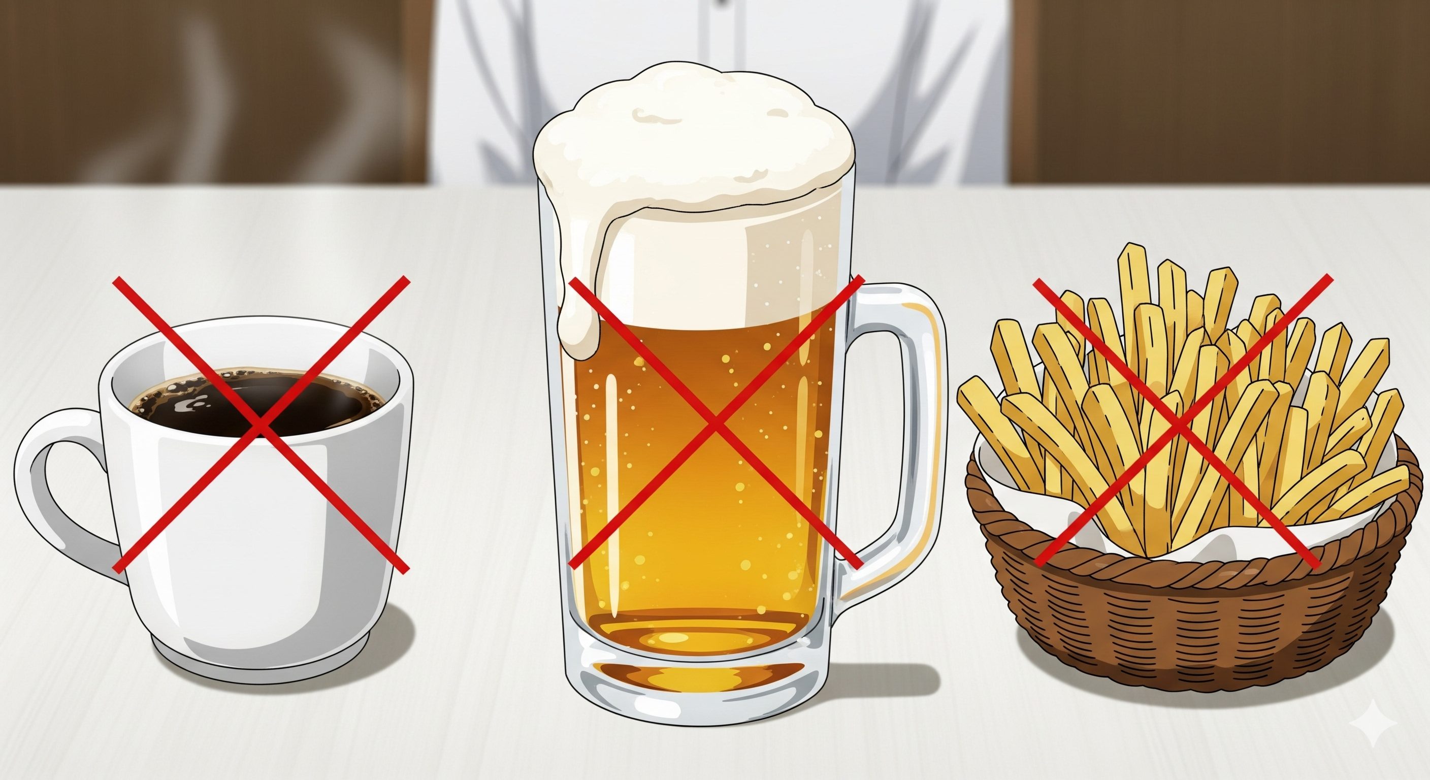 最後に、回復を妨げたり、症状を悪化させたりする可能性のある食べ物・飲み物をリストアップします。完全に断つ必要はありませんが、体調が万全になるまでは少し控えることをおすすめします。