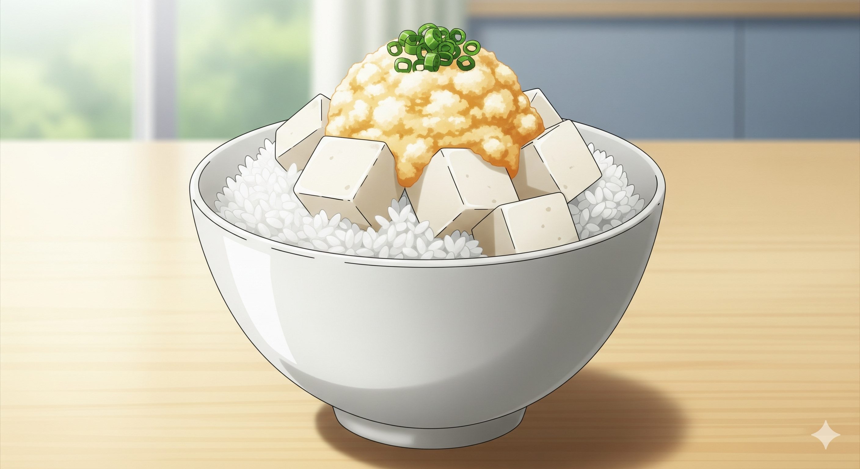 - 豆腐をスプーンですくってご飯の上に乗せます。