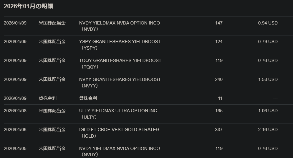 | 1/9 | NVDY (2回目) | 0.94 USD | 147円 |