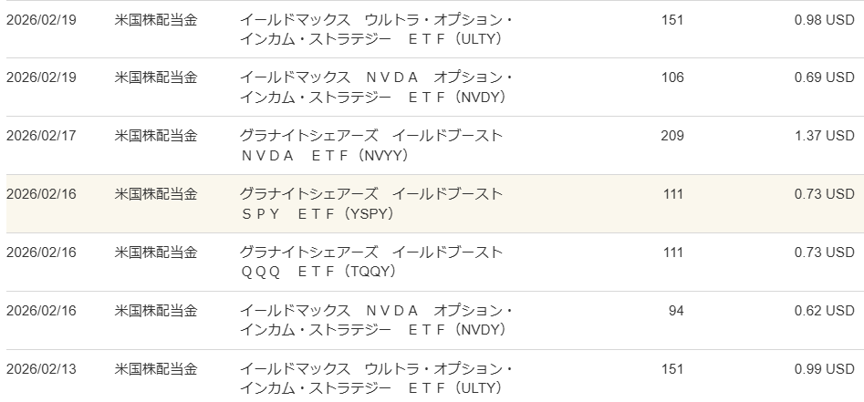 | 2026/02/17 | グラナイトシェアーズ イールドブースト NVDA | NVYY | 1.37 | 今回の稼ぎ頭 |