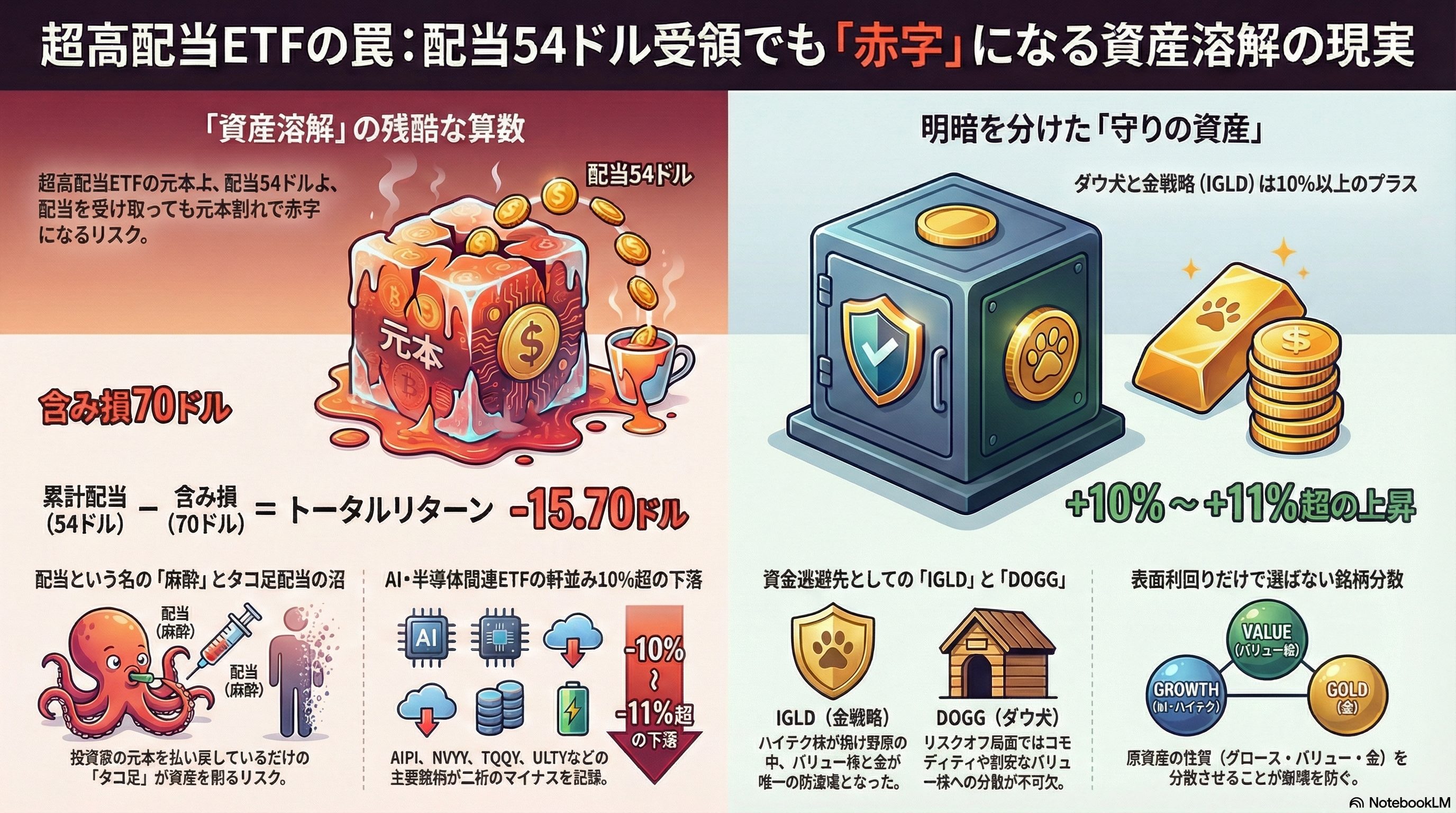 - 2026/2/21:【26年2月3週:資産溶解】配当54ドル受領も赤字!AI高配当ETFの罠と、輝くダウ犬・金