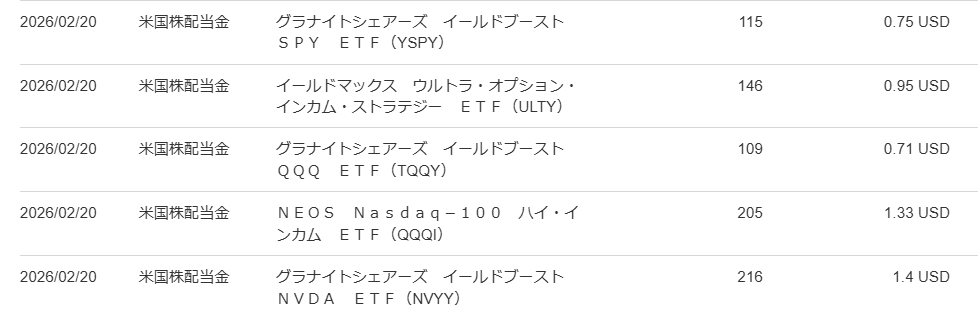 | 2/20 | NEOS Nasdaq-100 ハイ・インカム | QQQI | 1.33 USD | 205円 |