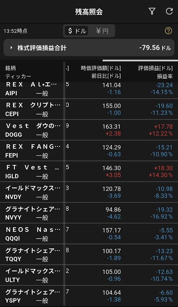 | 4位 | ULTY | -4.20ドル | -3.03ドル | -10.74% |