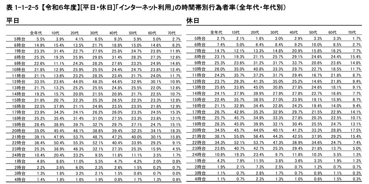 次に総務省が発表しているインターネット利用に関する調査結果 です。これらの調査は、幅広いユーザーの利用状況を客観的に把握できるため、信頼性の高い指標となります。年代別や平日・休日ごとのインターネット利用時間帯の傾向が示されており、ターゲット層に合わせた最適な投稿時間を導き出すことが可能です。