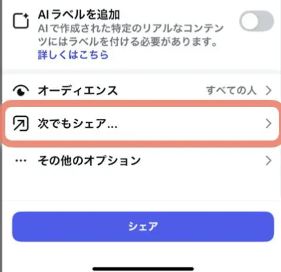 同じ内容を複数のアカウントに同時に投稿したい場合、便利な機能があります。フィード投稿を作成し、キャプションなどを入力する最後の画面で、「次でもシェア…」という項目が表示されます。ここでオンにしたアカウントに、同じ投稿が同時にシェアされます 。
